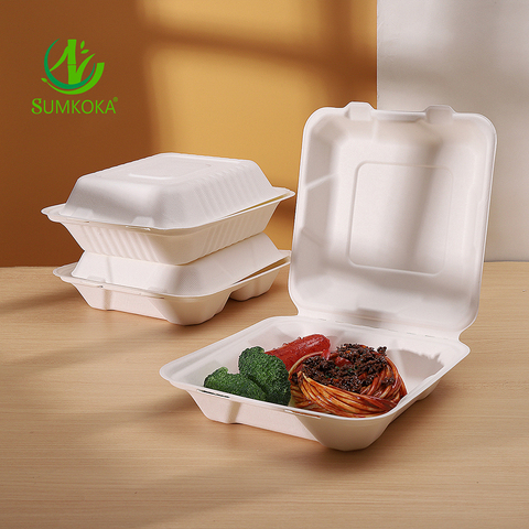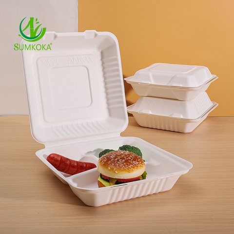 Sumkoka Biologisch Afbreekbaar Wegwerp Suikerriet Bagasse Papier Pulp Mal Clamshell Suikerriet Bagasse Voedselverpakkingen Tafelgerei